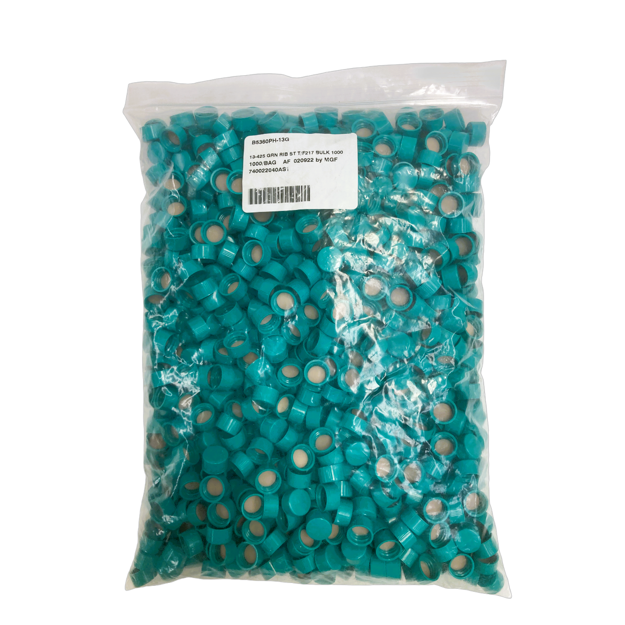 13-425mm Green Ribbed Thermoset Solid Top Cap, PTFE/F217 Lined, Bulk Pack of 1000