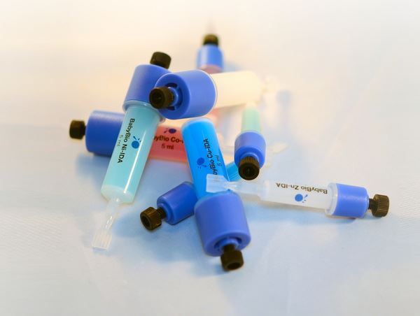 BabyBio™ His-tag Screening kits contain columns that are pre-packed with cross-linked agarose based resin that can be used in the purification of proteins in biotechnology research and method development. The base matrix, WorkBeads,™ is highly porous to enable optimal protein interaction. The metal ion is immobilized on the media via a chelating ligand based on iminodiacetic acid (IDA) or nitrilotriacetic acid (NTA). The resin in the column then has either Ni2+, Co2+, Cu2+ and Zn2+ immobilized on it