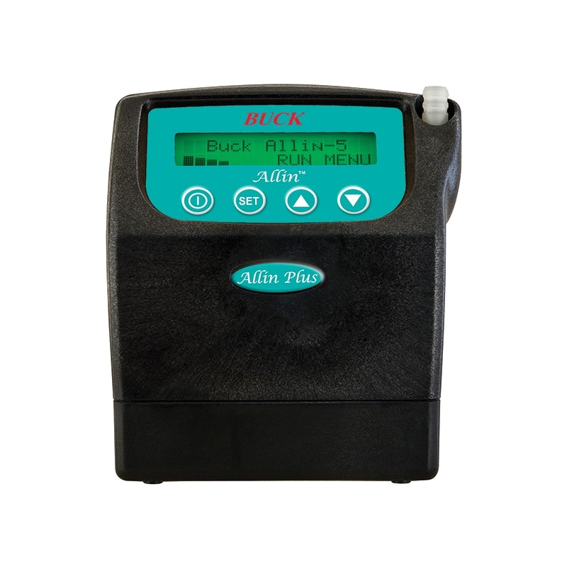 The BUCK Allin Plus™-5 is A.P. Buck Inc's latest Intrinsically safe approved 5 lpm personal air sampler. The pump consists of a high impact steel fiber filled Lexan, antistatic, and RFI/EMI-shielded case, exclusive electronic circuit board for constant flow control, an LCD display with 2 lines of 16 characters, a single diaphragm pump mechanism, and a rechargeable NiMH battery pack.