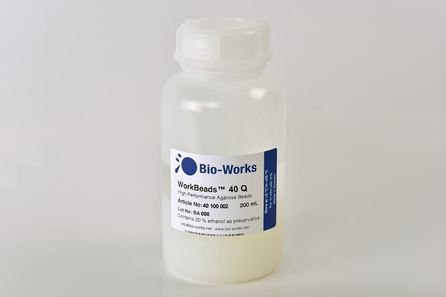 WorkBeads™ 40Q resin for ion exchange chromatography is designed for research and industrial scale purification of proteins, peptides and oligonucleotides by utilizing the difference in their surface charge. WorkBeads 40Q resin is a strong anion exchanger derivatized with quaternary amine ligands while its contrary WorkBeads 40S is a strong cation exchanger derivatized with sulfonate ligands. These resins demonstrate the property of high-resolution separation while giving low backpressure facilitate both capture and polishing purification applications in standard bioprocess columns.