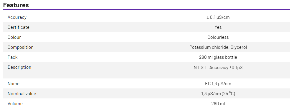 1x280 ml XS Conductivity Standard 1,3 µS/cm ± 0,1 / 25°C glass bottle with N.I.S.T certificate