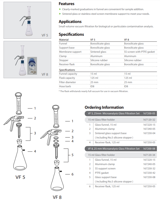▸ Funnel: Borosilicate glass ▸ Support base: Borosilicate glass ▸ Membrane support: Sintered glass ▸ Clamp: Aluminum ▸ Stopper: Silicone rubber ▸ Receiver flask: Borosilicate glass | ▸ Funnel capacity: 15mL ▸ Flask capacity: 125mL ▸ Filter diameter: 25mm ▸ Hose barb: ID8 ▸ Effective filtration area: 3.1 cm2 |