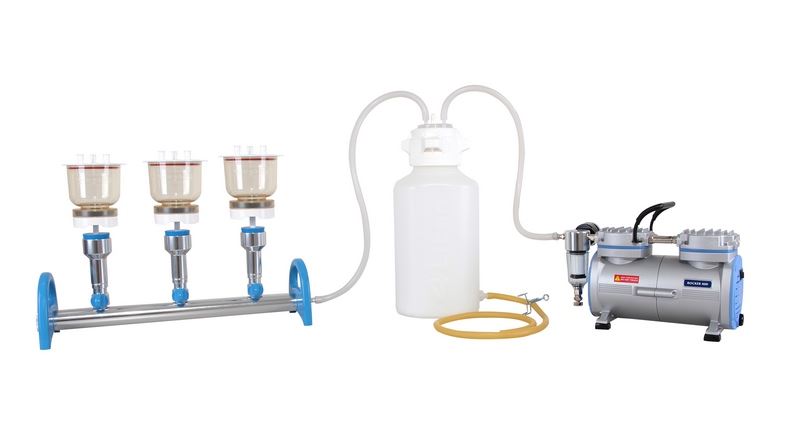| 180311-11(22)-T | MultiVac 310-MS-T Vacuum Filtration System includes : ▸ Rocker 400, Oil Free Vacuum Pump ▸ MultiVac 310-MS, 3-Places Aluminum Manifold ▸ MF 3, 300 ml Magnetic Filter Holder (3 pcs) ▸ 4000 ml PP Vacuum Bottle with drain ▸ Silicone Tube (1m x 2pcs) |