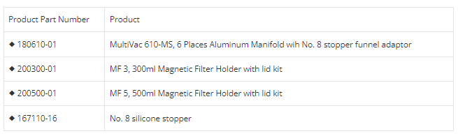 MultiVac 610-MS manifold includes No. 8 silicone stoppers which can accept various types of filter holders at option.