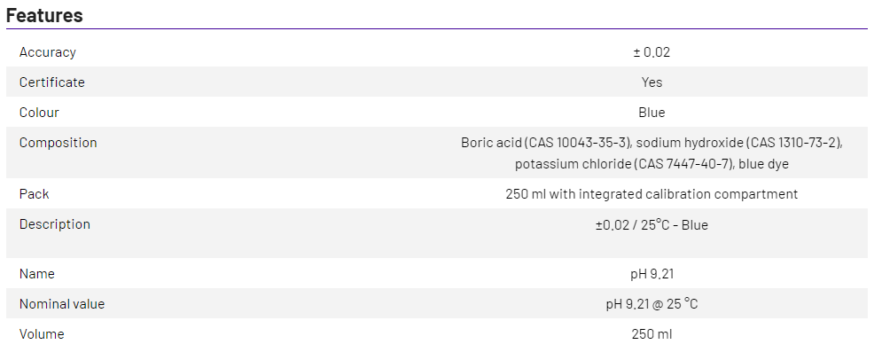 - pH 9.21 ± 0.02/25 °C. Blue. 250ml.