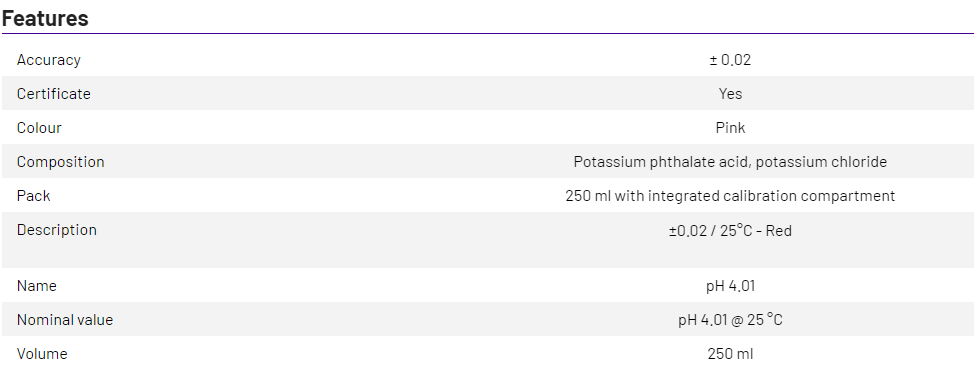 1X250ml XS Professional pH 4.01 ±0.01@25°C, with DAkkS Certificate pH 4.01 ±0,01 / 25°C - Red