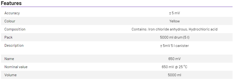 XS Redox/ORP 1x5Lt 650 mV ± 5mV / 25°C with N.I.S.T certificate (Politainer Cubibox) Item: 51100333