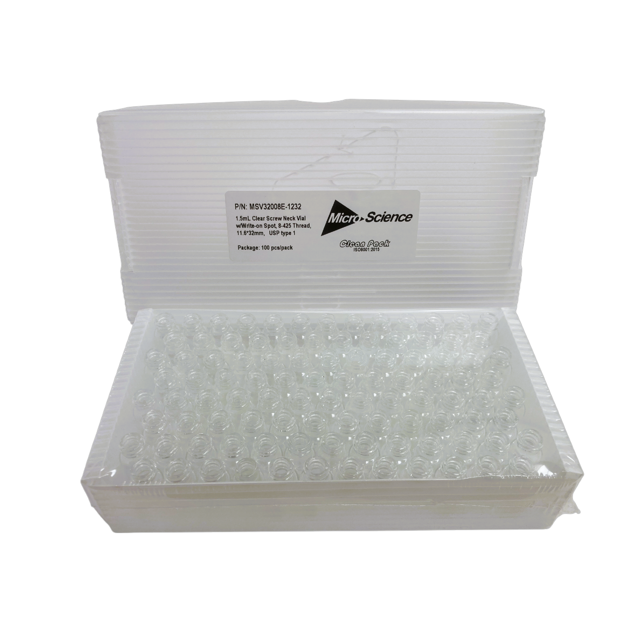 Standard Opening Screw Thread Vials, 12x32mm, 8-425mm Neck Finish. Narrow opening allows use of 8-425mm closures and septa. Designed to work in a variety of autosampler requiring narrow neck vials. Choose from clear or amber Type I borosilicate glass. Available with graduated marking spots.