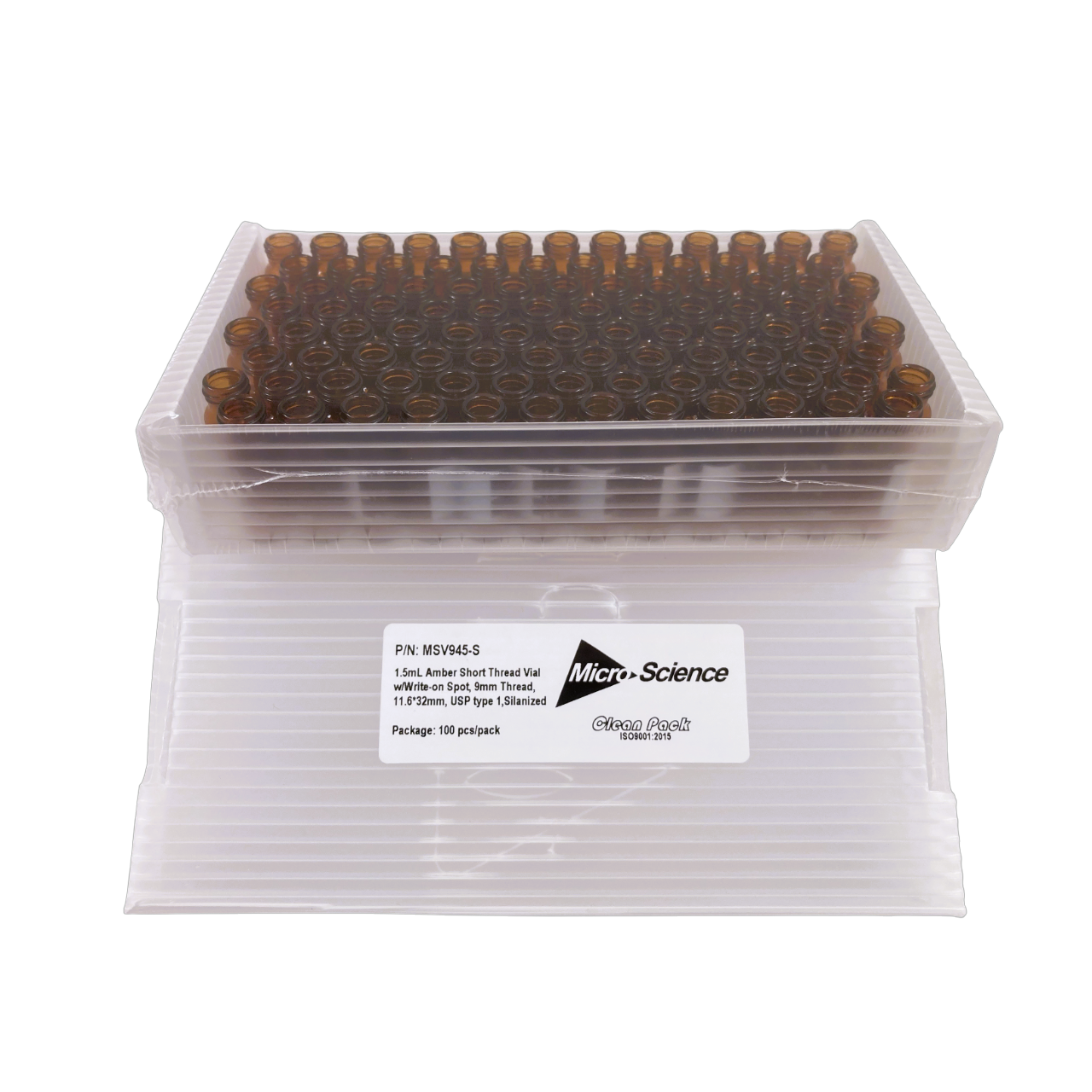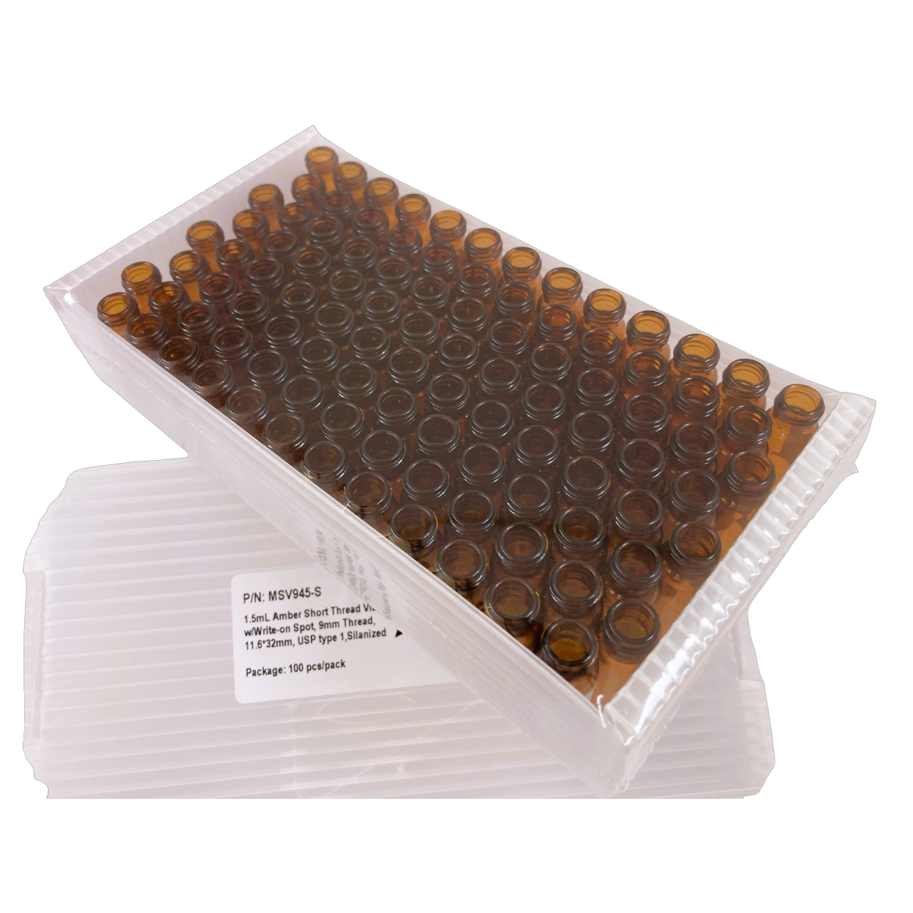1.5ml Amber Short Thread Vial, w/Write-on Spot, 9mm Thread, 11.6*32mm, USP type 1, Silanized, pk100, MSV945-S
