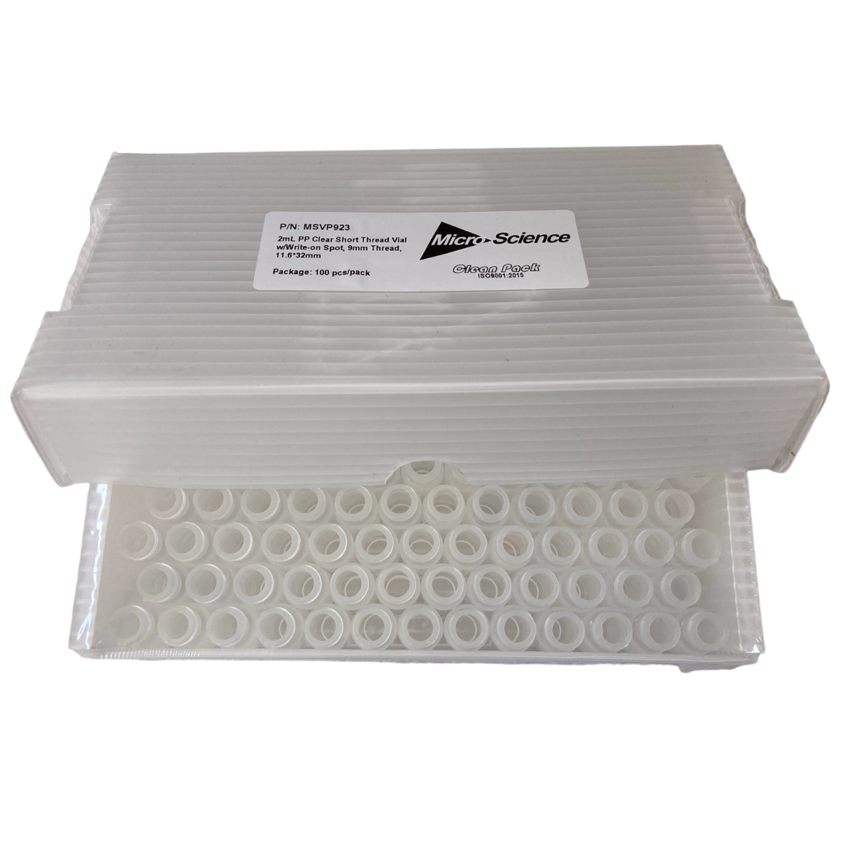 Manufactured from virgin polypropylene, meeting requirements of 21 CFR 177.1520. Wide-opening glass/plastic vials have a glass flanged insert molded to the inside, so the sample only comes in contact with a high-quality glass insert and septum. Polypropylene is chemically resistant and the material of choice for pH-sensitive samples, sodium, or heavy metal analyses. Polypropylene vials are translucent.