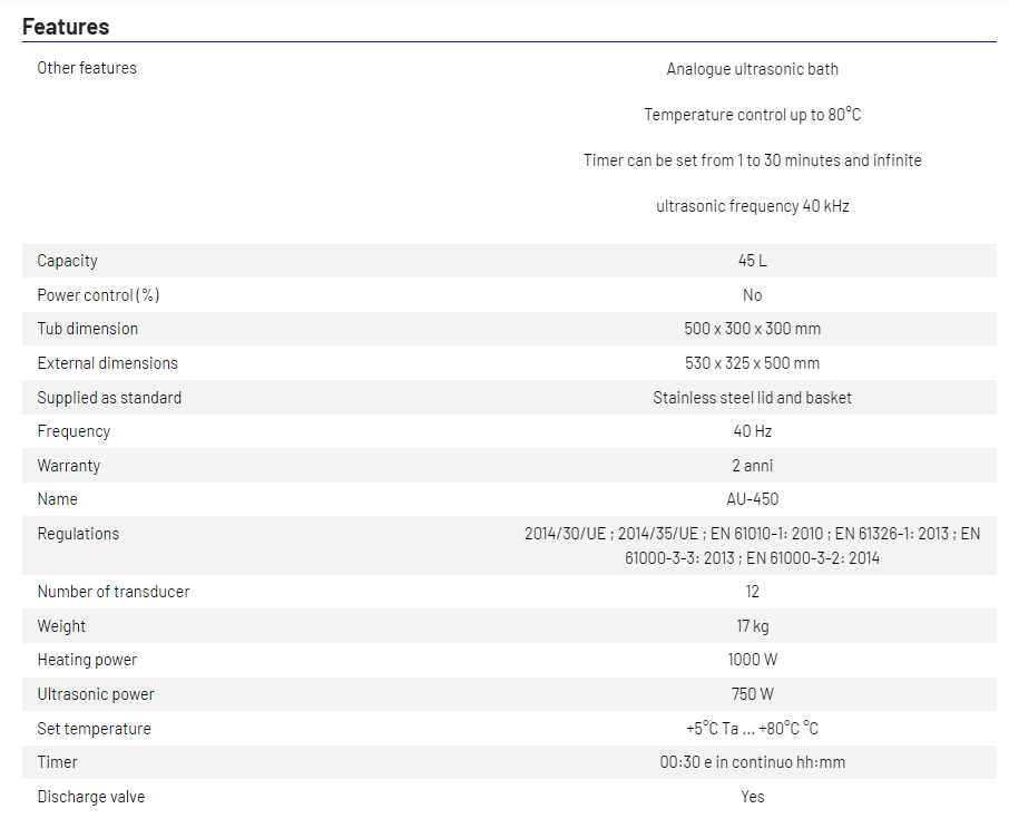AU-450 Analogic ultrasonic cleaner, max capacity 45 Lt, Temperature range to 80 °C, Timer 1-30 min. Included stainless mesh basket, stainless lid and 1x30ml concentrate universal cleaner solution.