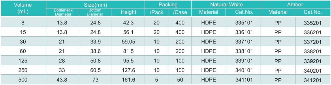 Cat.No.Volume(ml)Materialcolor/Pack /Case