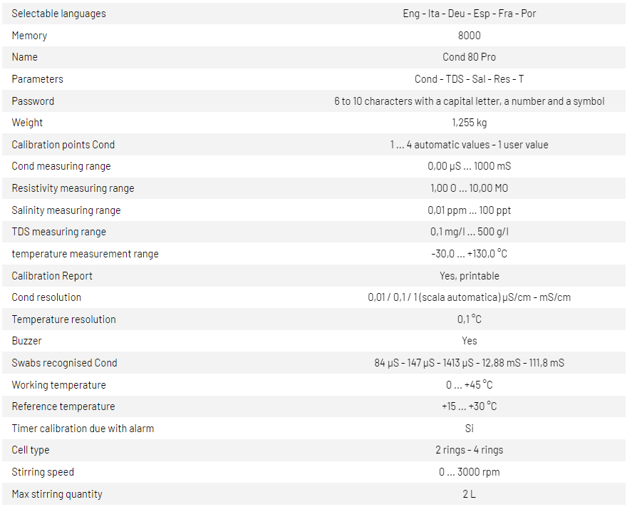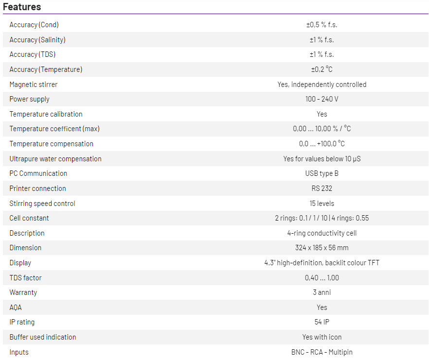 Automatic calibration of up to 4 conductivity standards (84, 1413 microS, 12.88 mS, 111.8 mS) from 1 to 4 points with calculation of different cell constants + 1 point of user's choice.