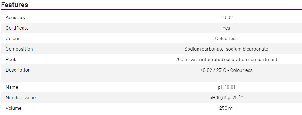 1X250ml XS Solution pH 10.01 ±0.02/25°C ( colourless), with certificate traceable to NIST