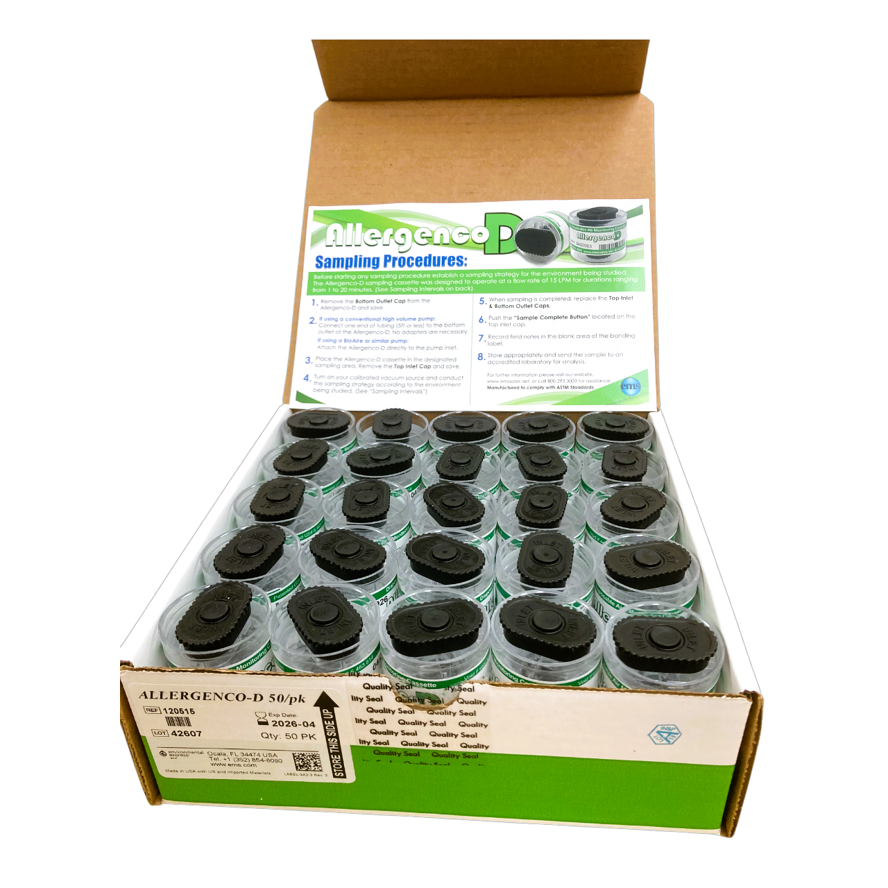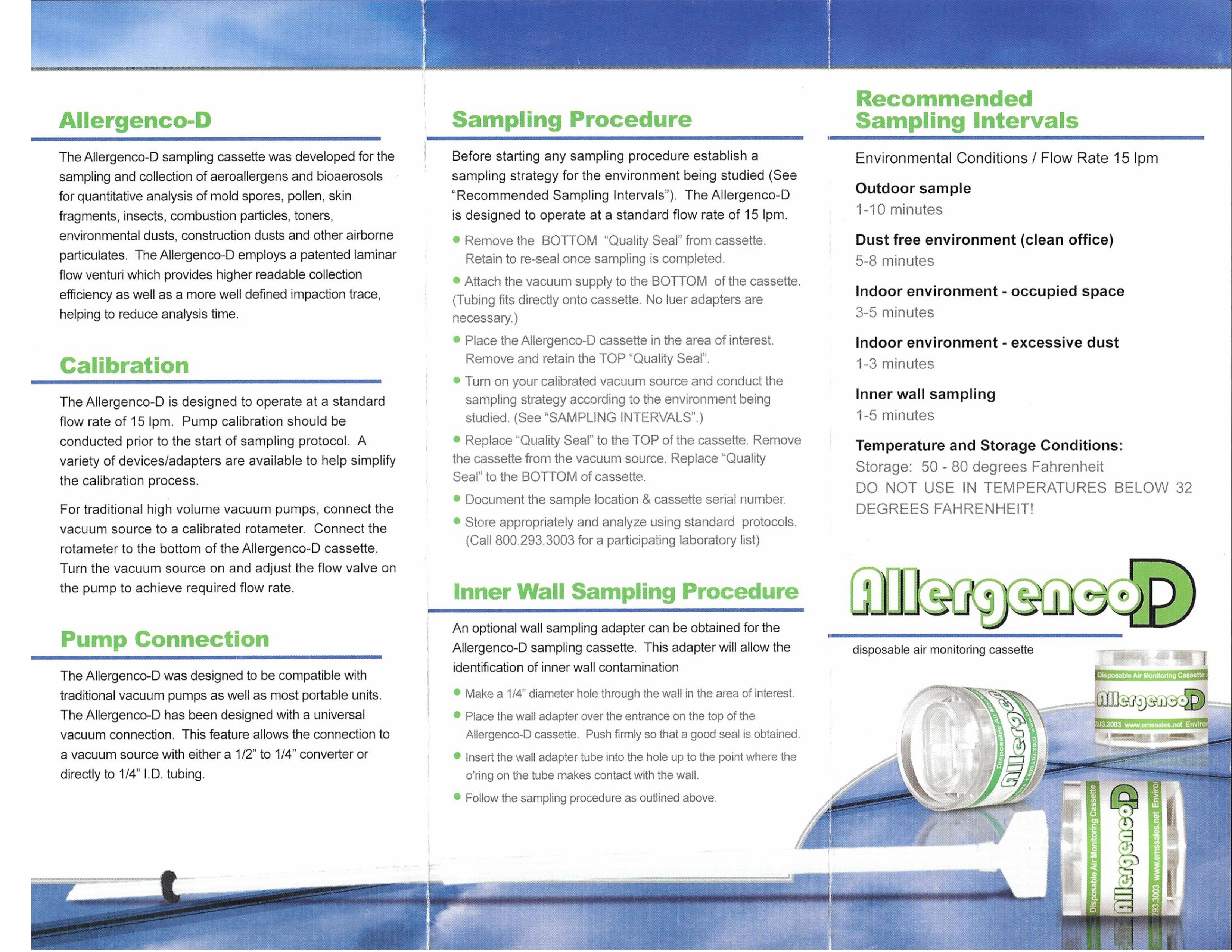 The Allergenco-D IAQ air sampling cassette was developed for the sampling and collection of aeroallergens and bioaerosols for quantitative analysis of mold spores, pollen, skin fragments, insects, combustion particles, toners, environmental dusts, construction dusts, and other airborne particulates.