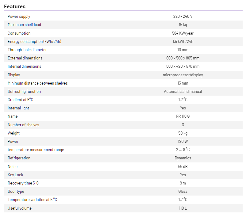 Professional refrigerator for laboratory use, with electronically controlled digital display, temperature alarms, open door and manual and automatic defrosting.