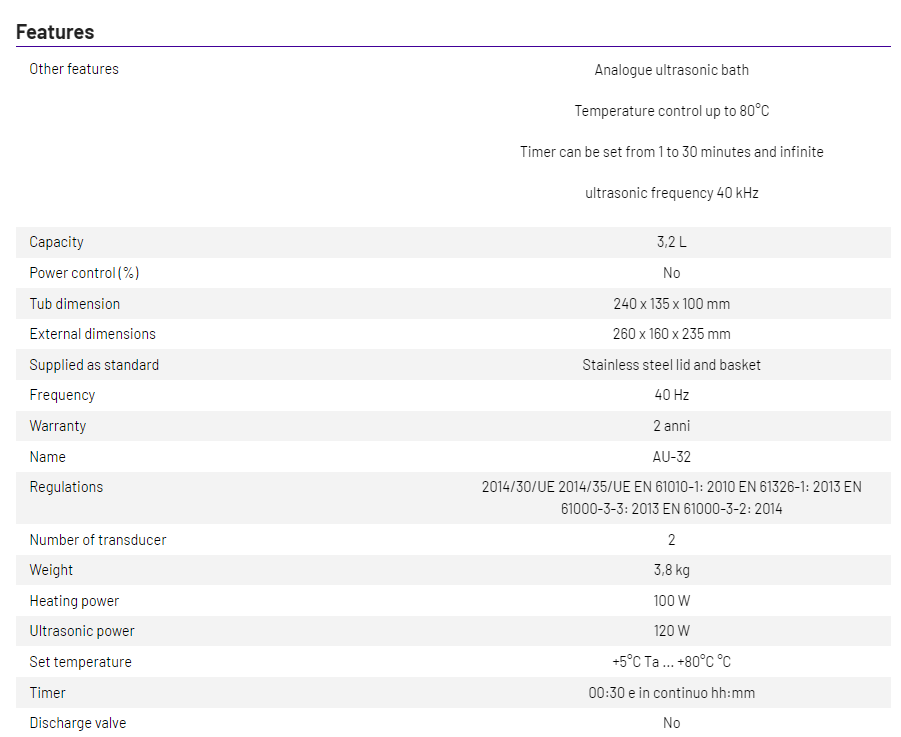 AU-32 Analogic ultrasonic cleaner, max capacity 3,2 Lt, Temperature range to 80 °C, Timer 1-30 min. Included stainless mesh basket, stainless lid and 1x30ml concentrate universal cleaner solution.