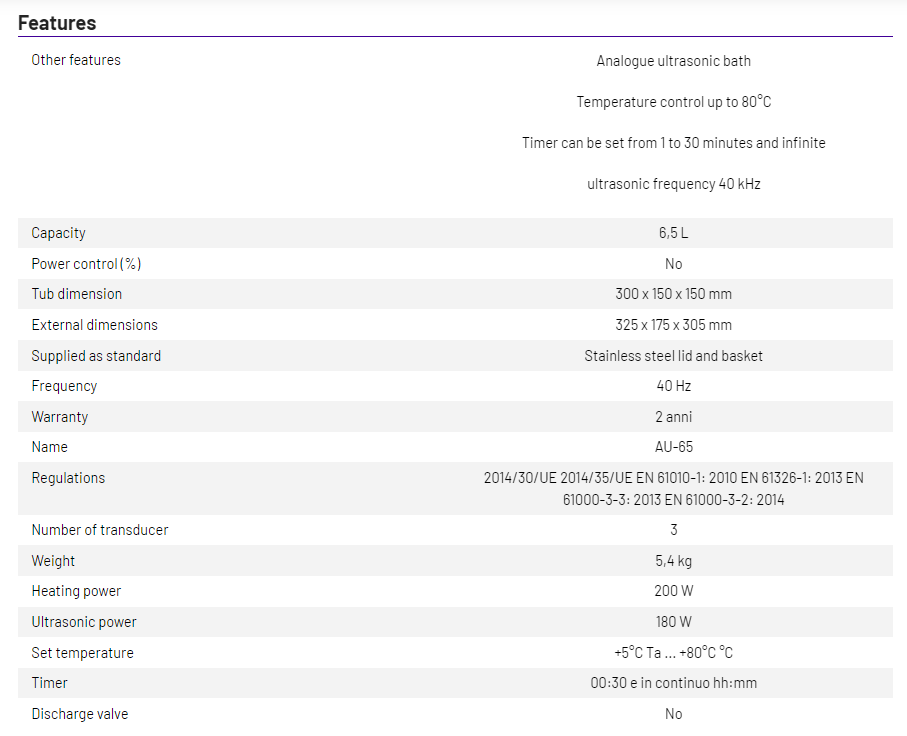 AU-65 Analogic ultrasonic cleaner, max capacity 6,5 Lt, Temperature range to 80 °C, Timer 1-30 min. Included stainless mesh basket, stainless lid and 1x30ml concentrate universal cleaner solution.