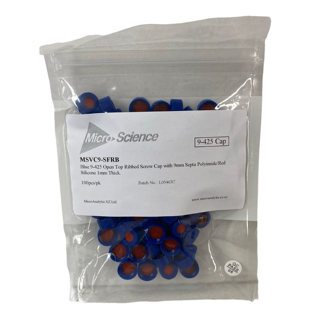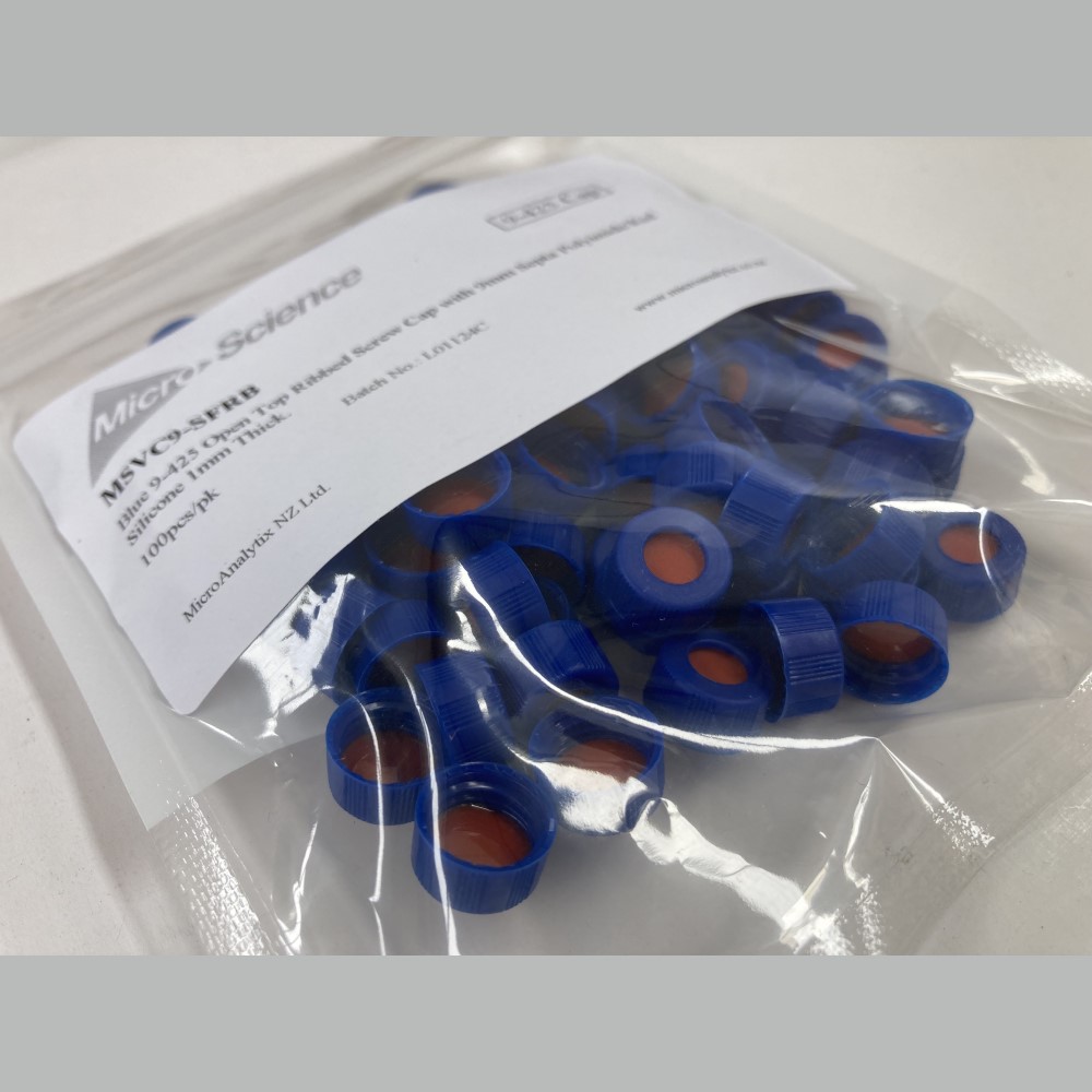 9-425mm Blue Open Top Ribbed Screw Cap with 9mm Septa Polyimide/Red Silicone 1mm Thick. 100pcs/pk MSVC9-SFRB