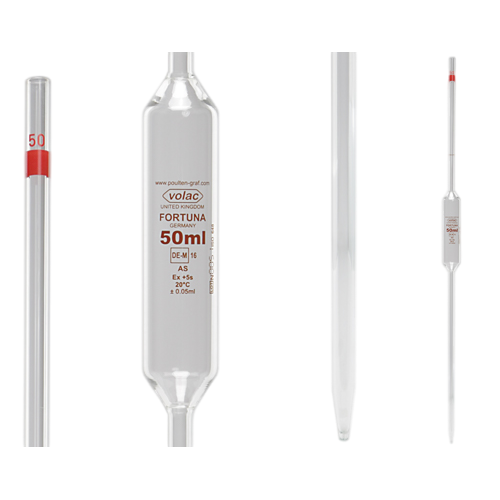 VOLAC FORTUNA® bulb pipettes are produced to the highest quality standards (EN ISO 648). They are offered in class AS conformity approved. VOLAC FORTUNA® bulb pipettes are calibrated to deliver (‘EX’) and are supplied with 1 or 2 ring marks.