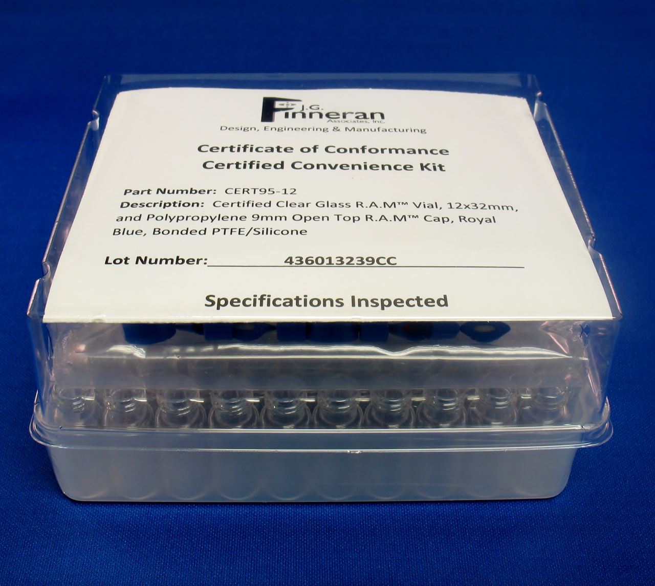 CERTACLEAN® LC Certified Vial Kits LC Certified Vial Test Parameters include: 2.0mL, 12x32mm R.A.M.™ Vial with 9mm R.A.M.™ Royal Blue Polypropylene Open Top Cap Glass - Type I, Class A, 33 Expansion Clear or 51A Amber Borosilicate Dimensions – Height, Diameter, Bottom Thickness, Neck Length, Thread Profile, Annealing Cap/Septum – Diameter, Height, Thread Integrity, Center Flash, Septa Insertion Chemical Test – HPLC Test – Non-volatile residue, GC Test – Volatile Residue
