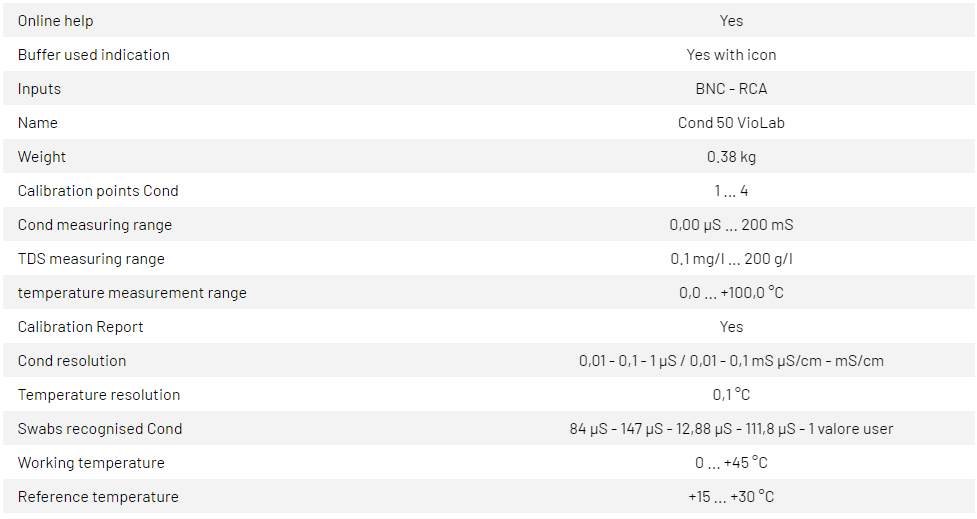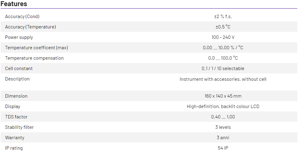 The online guide in setup and calibration allows a simple and immediate use of the device.Automatic calibration of conductivity up to 5 points (84; 147;