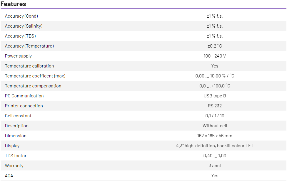 Electrode holder stand, conductivity standard, USB cable, multi socket power supply and user's manual.