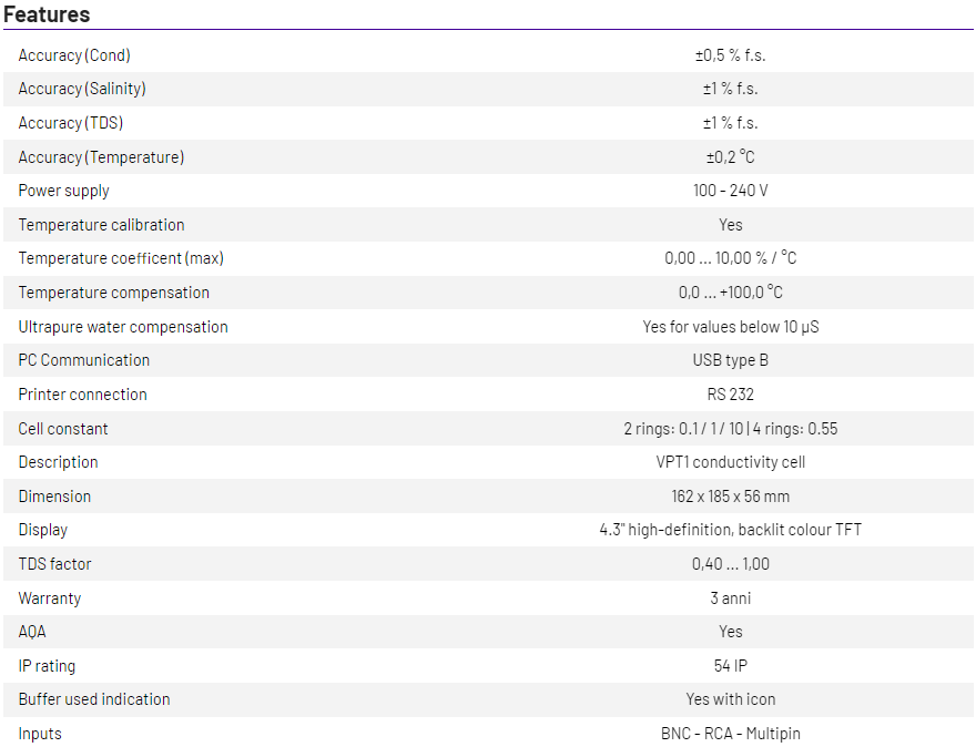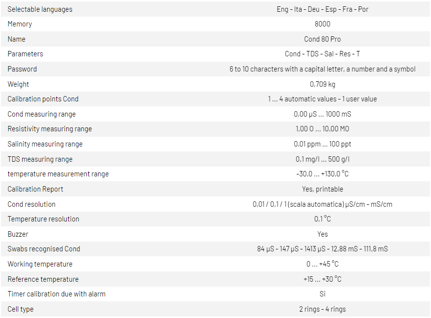 Automatic calibration of up to 4 conductivity standards (84, 1413 microS, 12.88 mS, 111.8 mS) from 1 to 4 points with calculation of different cell constants + 1 point of user's choice.