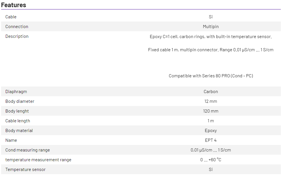 Conductivity cell mod. EPT 4, measuring range 0.1 μS…1 S, temp. 0…+80 °C, Cable fix Multipin connector only for 80 PRO Series, cell constant C= 0.55