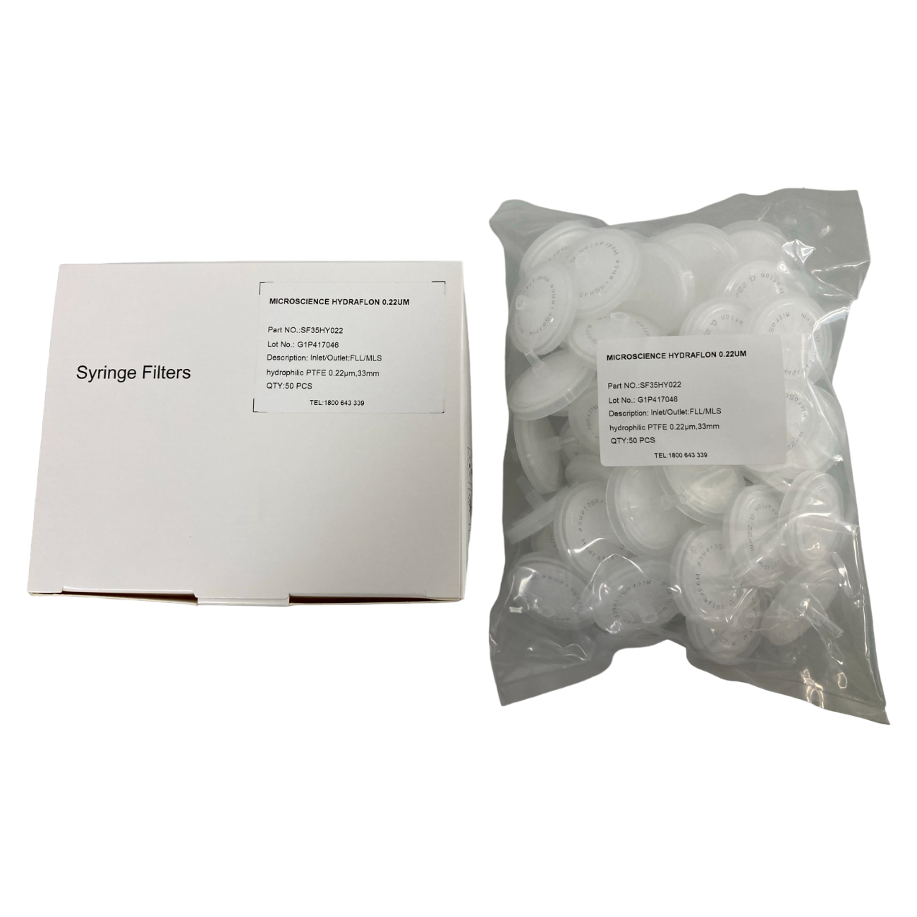The 35mm diameter syringe filters offer end users greater surface area, superior flow and process rates. The greater the area, the higher the processing capability. The 35mm diameter features 77% greater surface area than conventional 30mm diameter syringe filters and an amazing 131% more surface area than conventional 25mm diameter syringe filters. Hydraflon™ MEMBRANEHydraflon features a high flow, durable, all PTFE filter media. The Hydraflon media offers a broad chemical compatability and provides end users who are using multiple filter medias the opportunity to consolidate their use of different filter types to just one, for all their filtration requirements. The Hydraflon media is suitable for use in a broad range of applications and chemistries.
