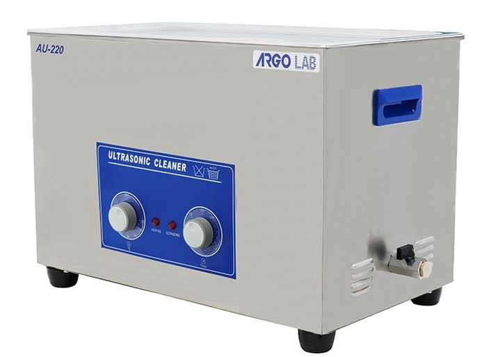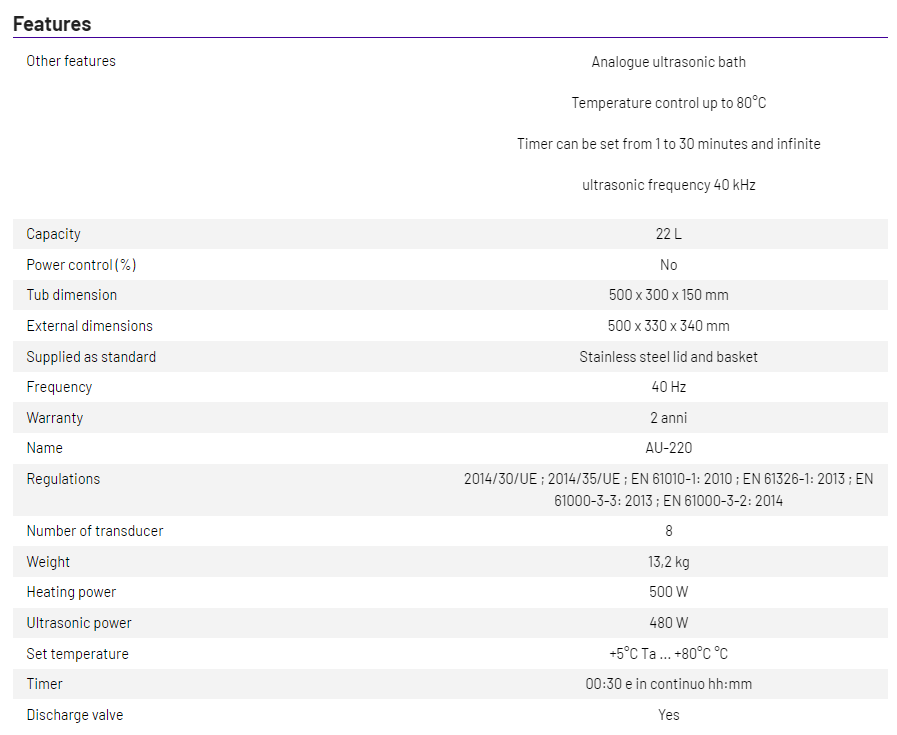 AU-220 Analogic ultrasonic cleaner, max capacity 22 Lt, Temperature range to 80 °C, Timer 1-30 min. Included stainless mesh basket, stainless lid.