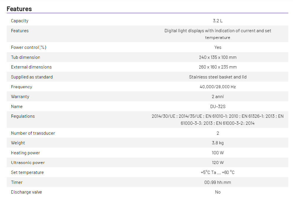 DU-32 Digital ultrasonic cleaner, max capacity 3,2 Lt, Temperature range to 80°C, Timer 1-99min, Ultrasonic power control 1-5.