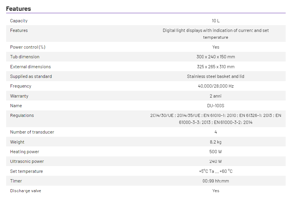 DU-100 Digital ultrasonic cleaner, max capacity 10 Lt, Temperature range to 80°C, Timer 1-99 min, Ultrasonic power control 1-5.