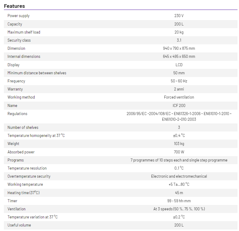 Temperature variation at 37 °C: ± 0.3 °C, uniformity of the temperature at 37 °C: ± 0.4 °C.