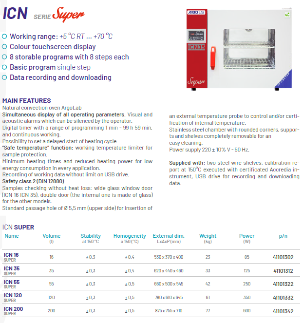 SUPER Version, color touch screen display, 8 programs that can be memorized with 8 steps each (temperature, time) and a further basic program with a single operating step (temperature, time). Recording of working data without limit on USB stick supplied.Packaging and transport included.
