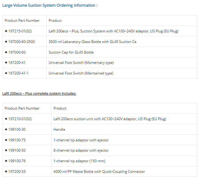 ▸ Vacuum range: 880~370 mbar abs. ▸ Max. flow rate: 10 L/min ▸ Aspiration rate: 17 mL/sec ▸ Waste bottle: 4L PP vacuum bottle / 3.5L laboratory glass bottle (optional) ▸ Auto shut-off: Yes ▸ Noise level: 55 dB ▸ Net weight: 2.3 Kg ▸ Dimension (LxWxH): 38 x 26 x 22 cm | ▸ Waste bottle – PP ▸ Handle – POM ▸ 1-channel tip adaptor with ejector – POM ▸ 8-channel tip adaptor with ejector – POM ▸ 1-channel tip adaptor (150 mm) – POM |