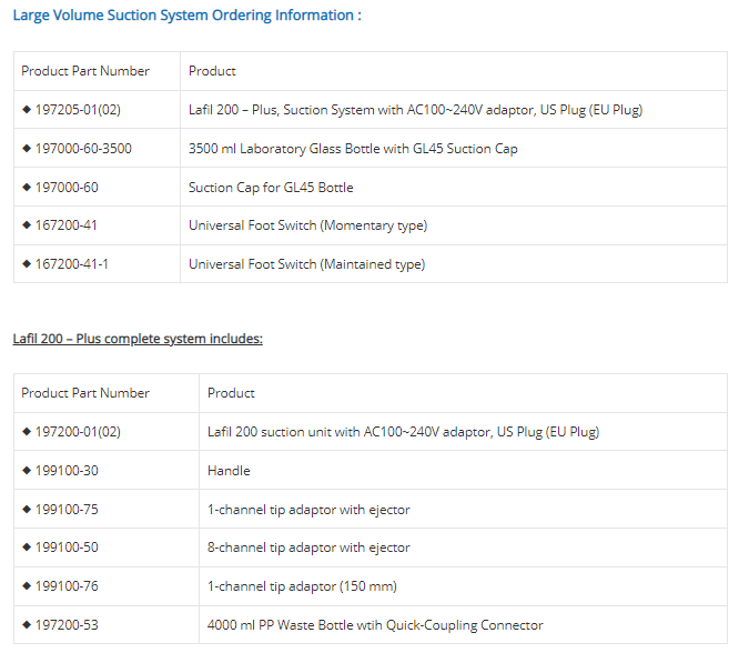 ▸ Max. vacuum: 1013 ~ 213 mbar abs. ▸ Max. flow rate: 10 L/min ▸ Aspiration rate: 17 mL/sec ▸ Waste bottle: 4L PP vacuum bottle / 3.5L laboratory glass bottle (optional) ▸ Noise level: 55 dB ▸ Net weight (Lafil 200): 2.1 Kg ▸ Dimension (LxWxH): 38 x 26 x 22 cm | ▸ Lafil 200 – ABS ▸ Waste bottle – PP ▸ Handle – POM ▸ 1-channel tip adaptor – POM ▸ 1-channel tip adaptor with ejector – POM ▸ 8-channel tip adaptor with ejector – POM |