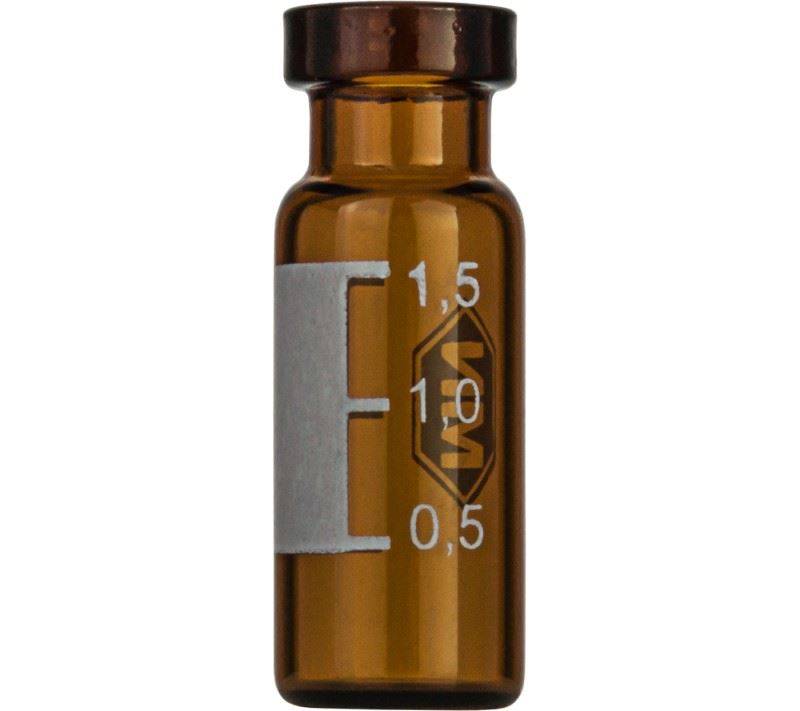 Pre-sealed vials 702892: 1.5 mL Crimp Neck Vial N 11 outer diameter: 11.6 mm, outer height: 32 mm amber, flat bottom, wide opening, label + scale crimped with 702823: N 11 Aluminium crimp cap, silver, center hole Silicone white/PTFE blue, cross-slit Hardness: 55° shore A Thickness: 1.5 mm pack of 100