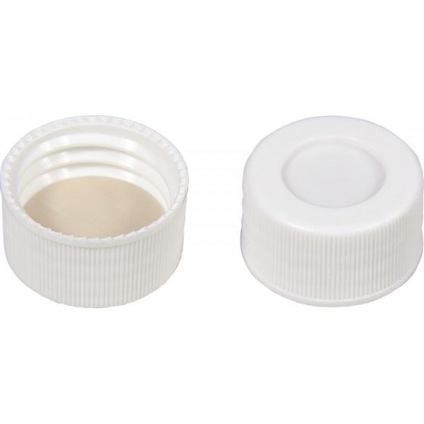 Pre-sealed vials 702021: 20 mL Screw Neck Vial N 24 outer diameter: 27.5 mm, outer height: 57 mm clear, flat bottom pre-screwed with 702059: N 24 PP screw cap (bonded), white, closed top Silicone white/PTFE beige Hardness: 45° shore A Thickness: 3.2 mm pack of 100