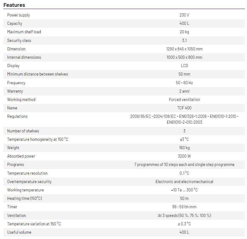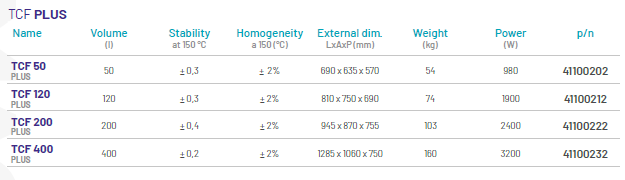 Range: from 10 °C above ambient temperature up to 300 °C. Net volume of 400 liters.