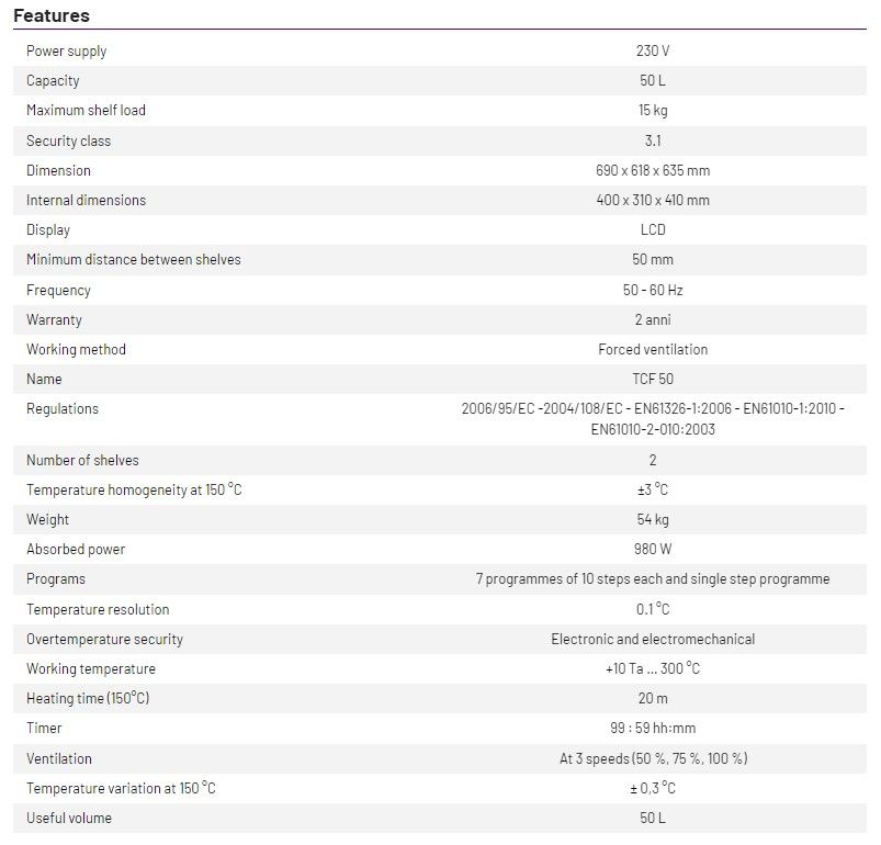 Range: from 10 °C above ambient temperature up to 300 °C. Net volume of 50 liters.