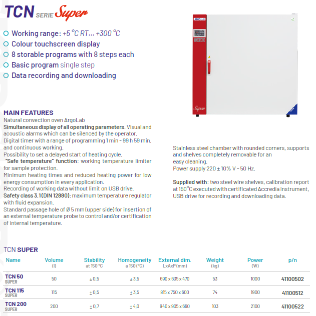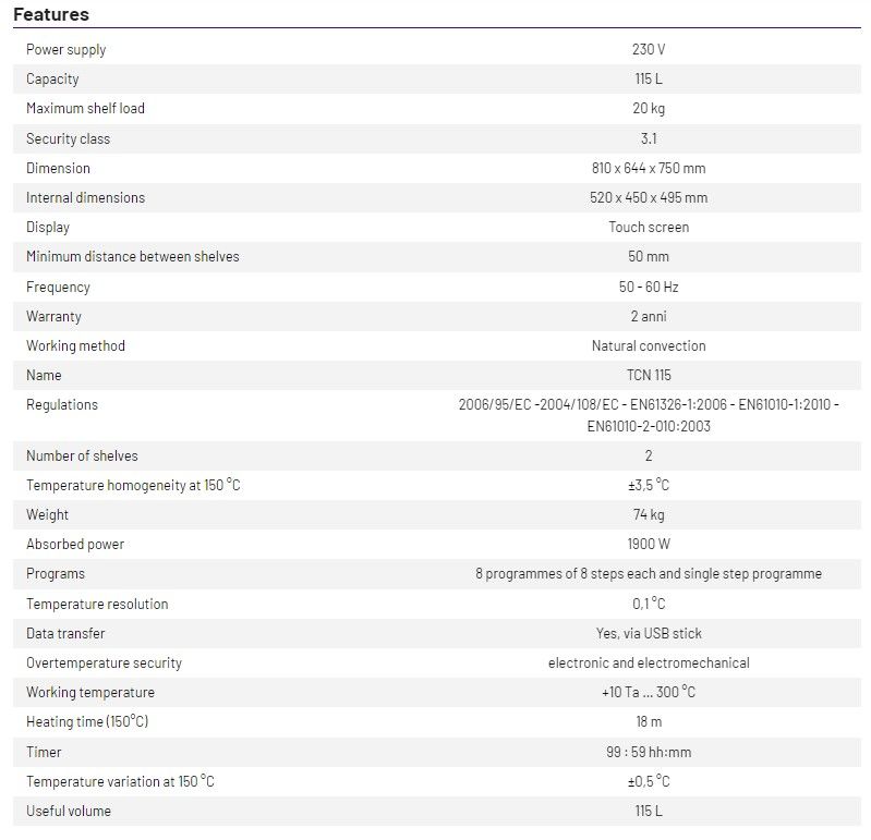 Working range: 5 °C above ambient temperature up to 300 °C. Net volume 115 liters.