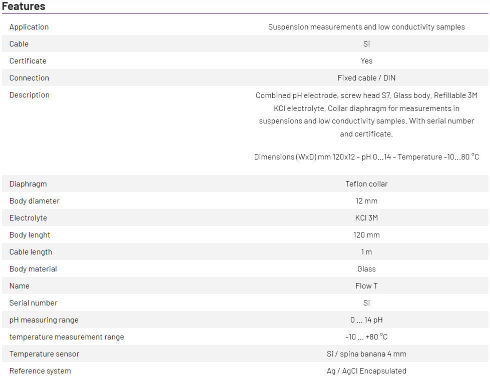 Combined pH electrode, fixed cable DIN + 4 mm banana plug, built-in PT 1000 temperature sensor.