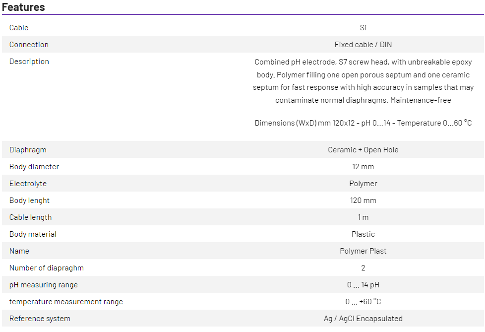 pH electrode combined with fixed cable 1m DIN plug, with unbreakable epoxy body.