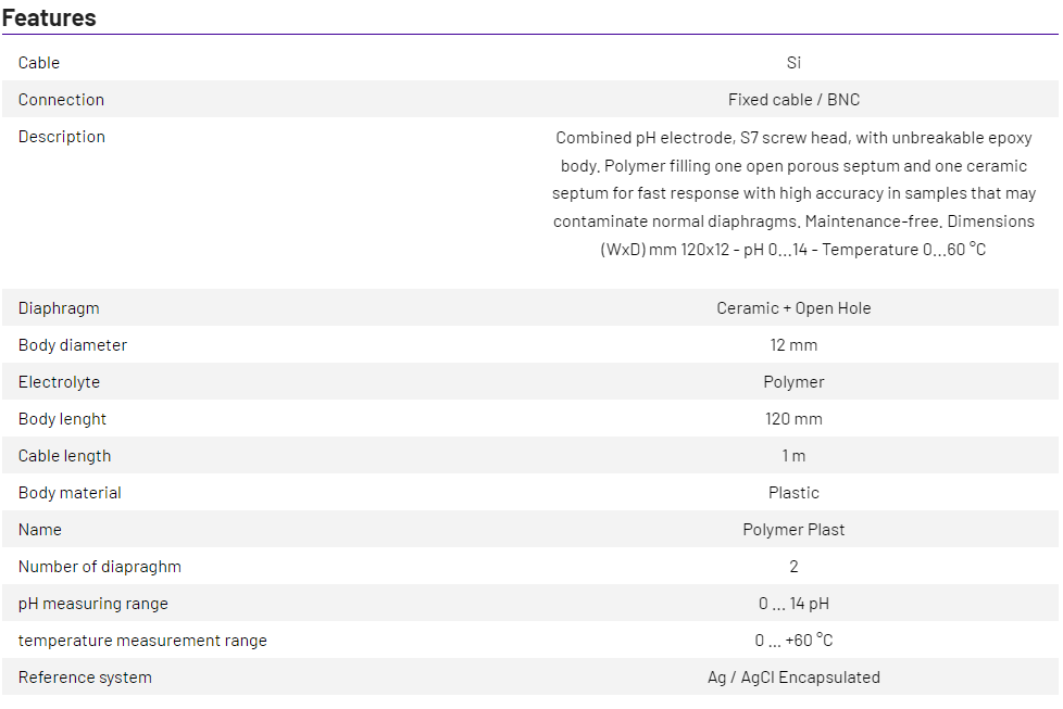 pH electrode combined with fixed cable 1m BNC plug, with unbreakable epoxy body.