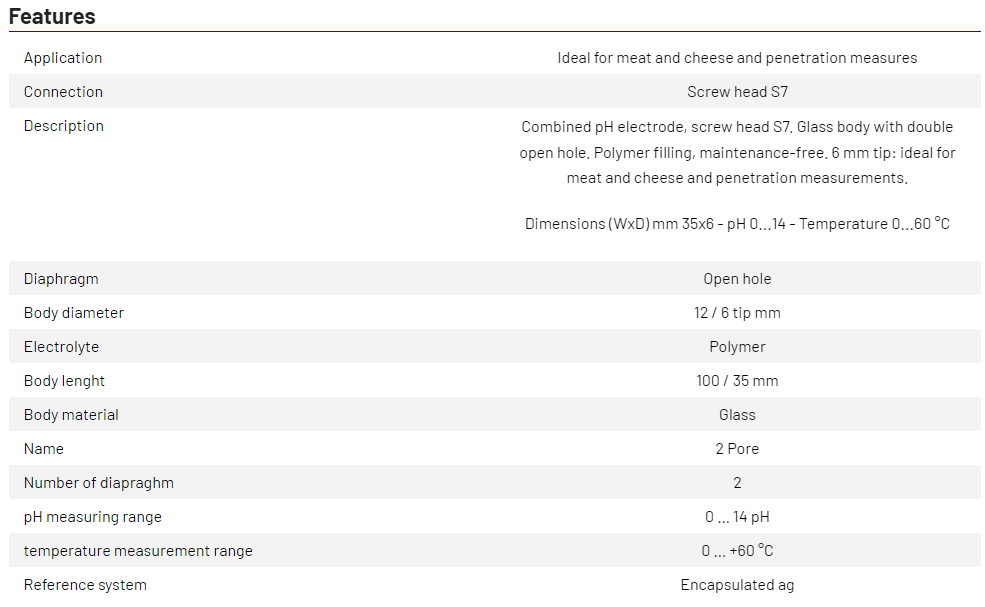 pH Electrode combined with S7 screw head. Glass body . Dimensions (LXØ) 35x6 mm.