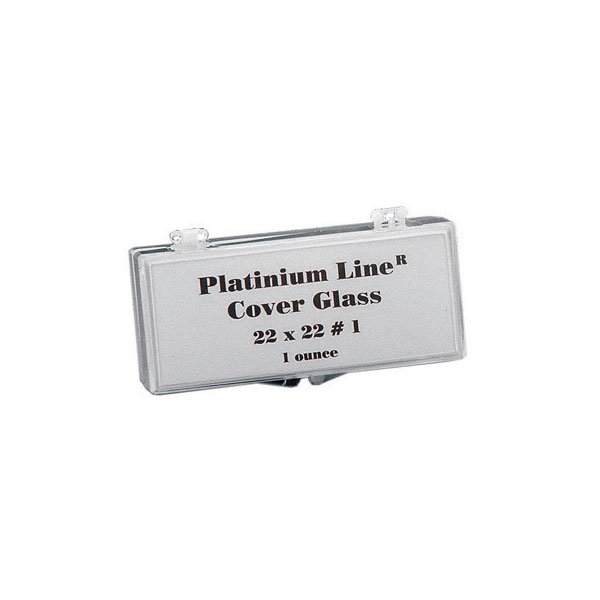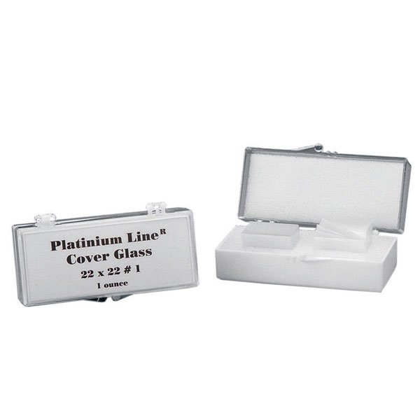 Platinum Line Microscope Cover Glass. Pre-cleaned, clear, non corrosive, non fogging. Available in #1 and #1.5 thickness. Packaged in 1oz boxes (approx 100 slides per box).