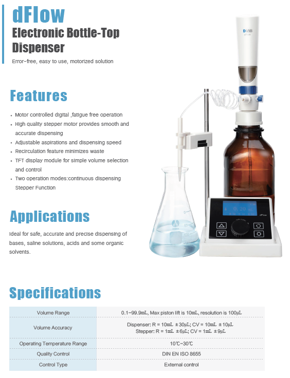 0.1-99.9mL, Max piston lift is 10mL, resolution is 100μL |