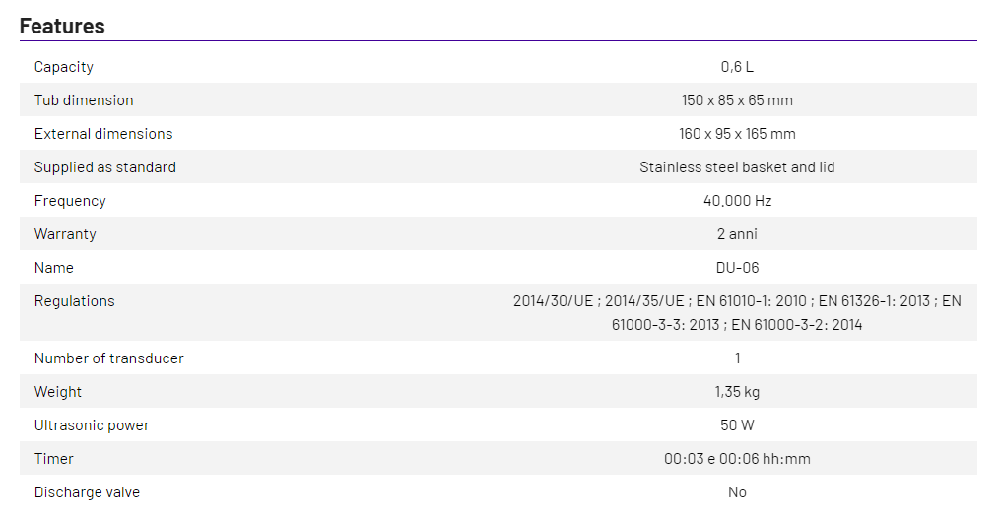 DU-06 Digital ultrasonic cleaner, max capacity 0,6 Lt, NO heating, timer 180/360 sec.