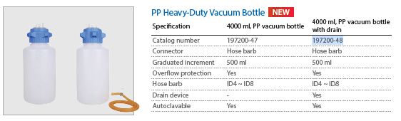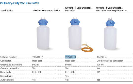 | Model | PP Vacuum Bottle, 4000 mL | PP vacuum bottle with Quick-coupling, 4000 mL | PP Vacuum Bottle with Drain, 4000 mL |